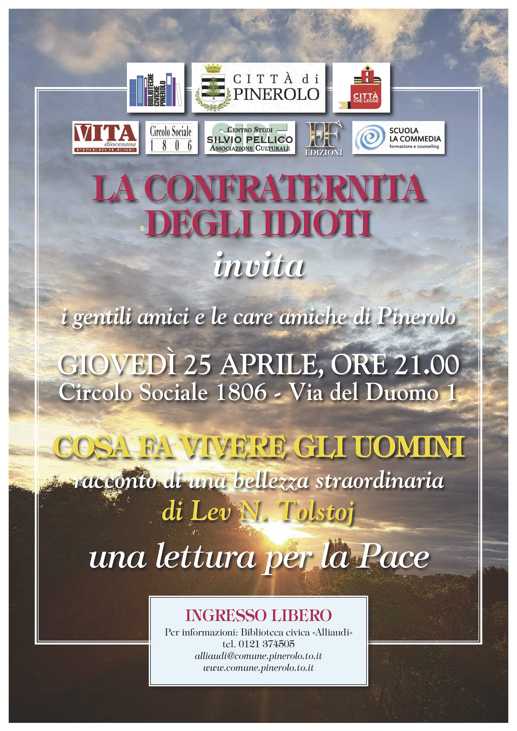 Giovedì 25 aprile, alle ore 21, presso il Circolo Sociale Pinerolo, su iniziativa della Biblioteca Alliaudi Pinerolo, del Centro Studi “Silvio Pellico” – Associazione culturale, Scuola La Commedia e Ivo Forza Edizioni, arriva a Pinerolo da Vicenza la “Confraternita degli Idioti“. Che idioti non sono per nulla, anche se parlare di pace, di bellezza e di speranza in questi tempi bui appare sempre più lontano dai messaggi che riceviamo ogni giorno.